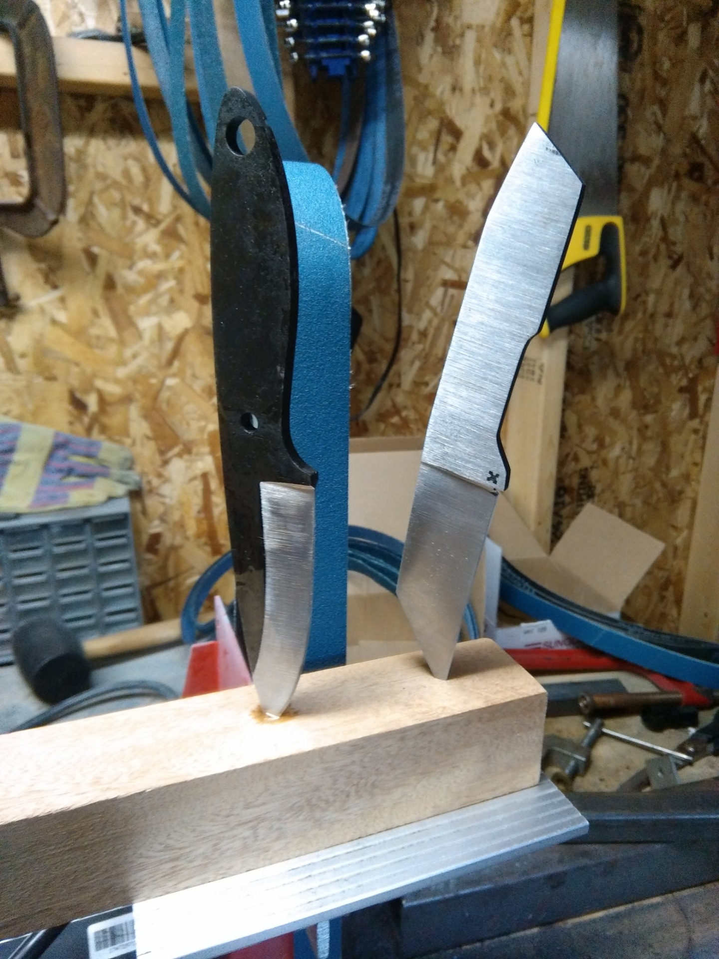 Two of the knives after heat treating and final grinding. Behind is the grinder that did the majority of the work.