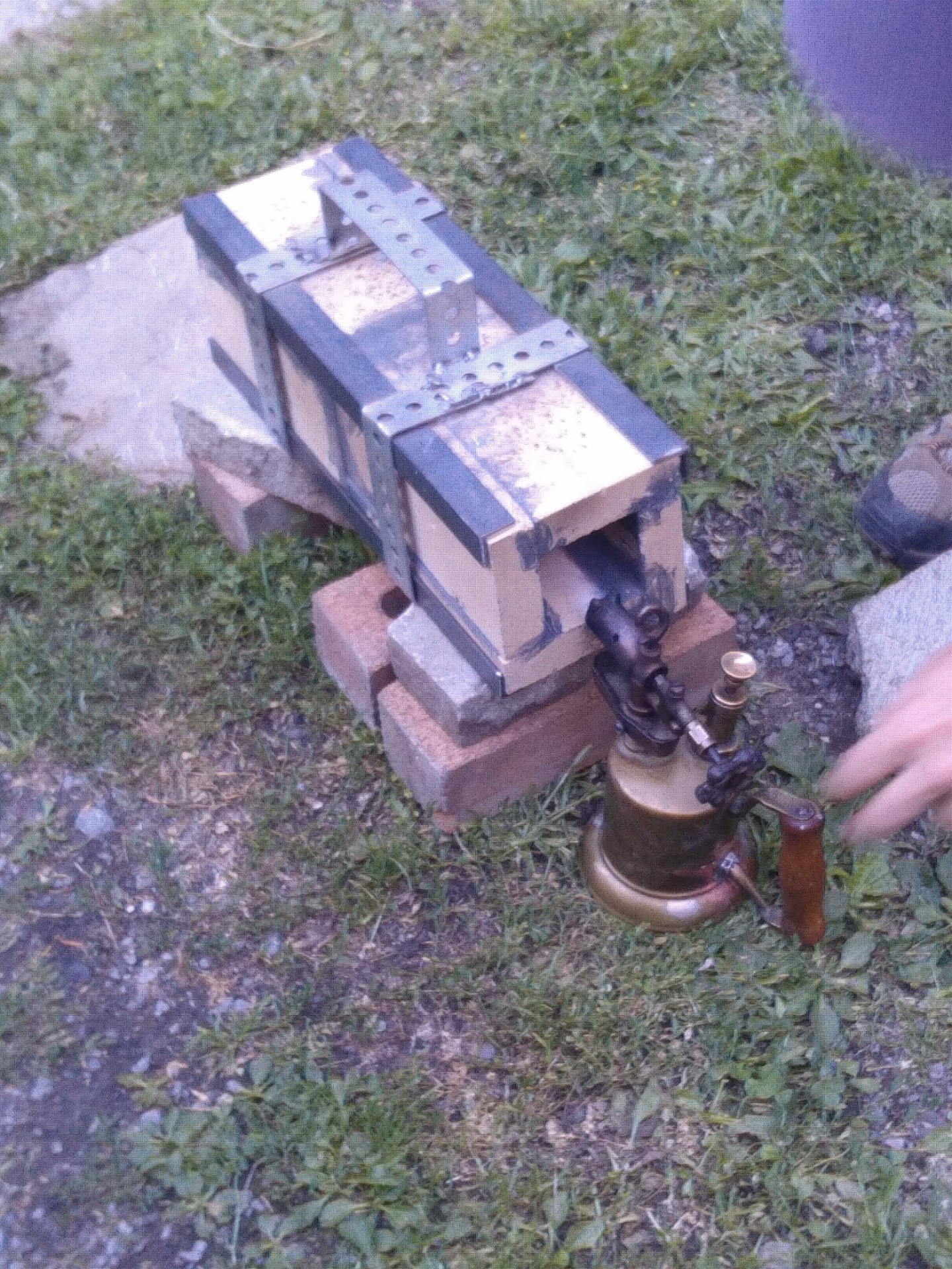 Furnace used to heat treat our knives. That torch was not used, instead a propane blowtorch was. Knives were heated to 1500° F and quenched in peanut oil. Tempering was done in a kitchen oven at 400° F.