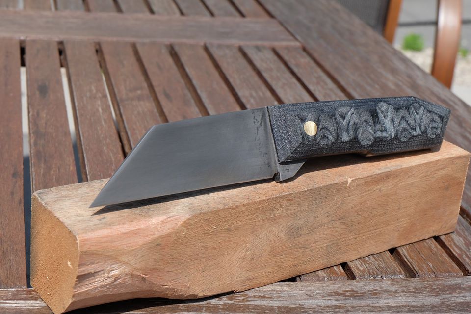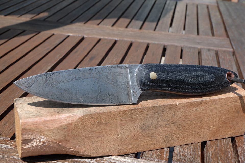During the summer of 2018 some friends and I decided to build knives together. I made three knives, all from 1084 steel. We made them entirely ourselves in our backyards, including heat treating and finishing. The handle scales are made of denim micarta, with brass and copper pins. The micarta was made by myself by layering old jeans and fiberglass resin and came out very nicely.